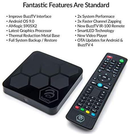 The All-New BuzzTV XR4000 is completely redesigned inside and outside. In addition to boosted hardware, there are enhanced features like Smart LED Light technology and Thermal reduction metal base. This model uses AMlogic S905X2 processor with 2GB DDR4 and an increased 16GB memory. BuzzTV keeps you up to date and protected from potential software vulnerabilities automatically with Android security patches sent OTA. XR4000 comes with BuzzTV IR-100 remote controller which is, slightly bigger, more buttons for 1-click actions and Smart learning remote.